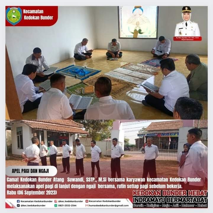 PAKKAR.ORG-INDRANAYU JAWA BARAT:Camat Kedokan Bunder Kabupaten Indramayu Jawa Barat.Atang Swandi MSi.Laksanakan rutin apel pagi di kantor kecamatan.(Kamis 7/9/2023).Setelah selesai apel pagi dengan stap dan karyawan masuk kantor “langsung mengaji”.Kebiasaan rutin sebelum melakukan tugas pelayanan wajib mengaji. Warga pun sudah faham jam kantor Camat mulai melakukan tugas pelayanan publik untuk kepentingan masyarakat.Apel pagi dan kegiatan mengaji…