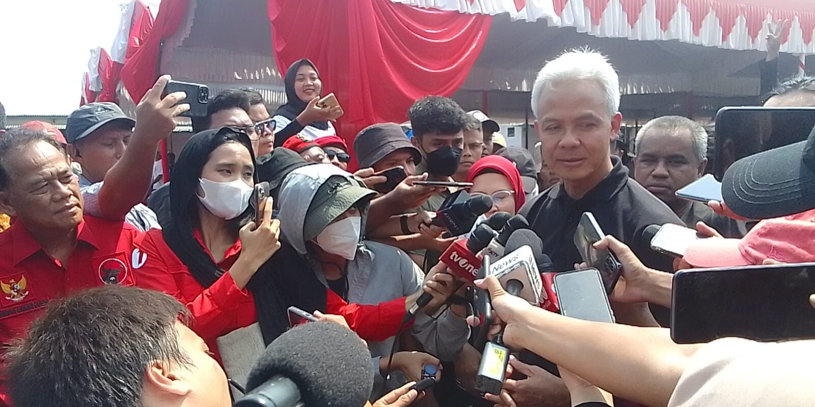 PAKKAR.ORG- INDRAMAYU JAWA BARAT:Calon Presiden (Capres) nomer urut 3 Ganjar Pranowo melakukan kampanye Politik di Kabupaten Indramayu, dengan menyapa ribuan pendukung di Tempat Pelelangan ikan (TPI) Desa Karangsong, Kecamatan Indramayu, Kabupaten Indramayu, Sabtu 23 Desember 2023.