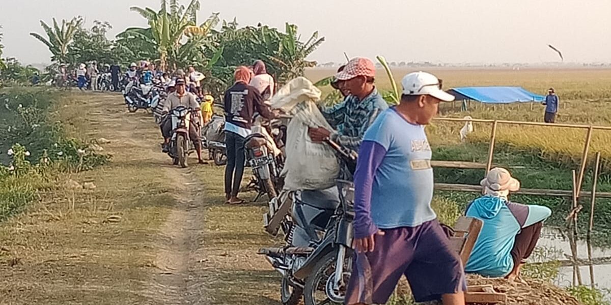 PAKKAR.ORG-INDRAMAYU JAWA BARAT:Tampak dalam gambar ratusan orang warga dari berbagai desa kembali datang jaragan (panen) padi wilayah Desa Sindang Kecamatan Sindang Kabupaten Indramayu Jawa Barat-Rabu (30/8/2023)