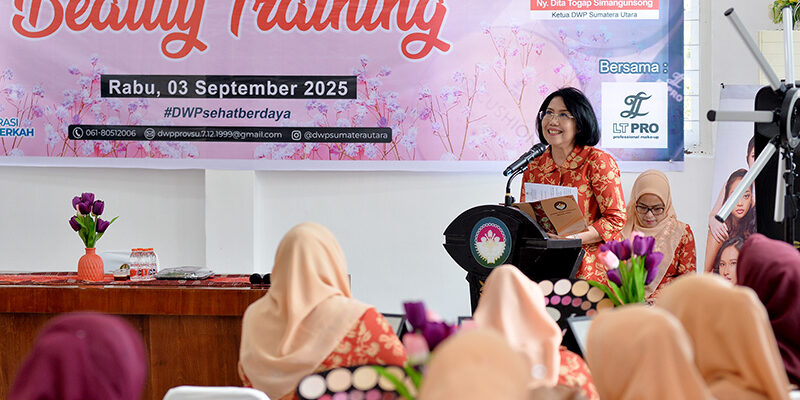 PAKKAR.ORG-MEDAN SUMUT :Ketua Dharma Wanita Persatuan (DWP) Provinsi Sumatera Utara (Sumut) Dita Togap Simangunsong menyebutkan pentingnya menjaga penampilan bagi seorang perempuan, baik saat beraktivitas di luar, maupun menjaga keluarga di rumah. Pesan itu disampaikannya, pada kegiatan Beauty Training bagi para anggota DWP Sumut di Aula Lantai 2 Kantor DWP Sumut, Jalan Cik Ditiro, Medan, Rabu (3/9/2025).