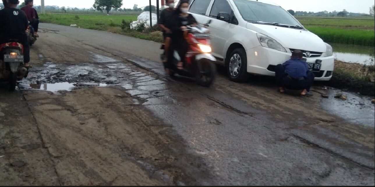 PAKKAR.ORG-INDRAMAYU JAWA BARAT:Tampak dalam gambar kendaraan pemudik Idul Fitri 22 April 20232 -1 Syawal 1444 H terpeleset dampak kerusakan jalan berkubang tepatnya jalan Gantar Sanca Kabupaten Indramayu Jawa Barat-(21/4/2023).(pakkar.org/ras/cp-tm/@foto:ruspani)