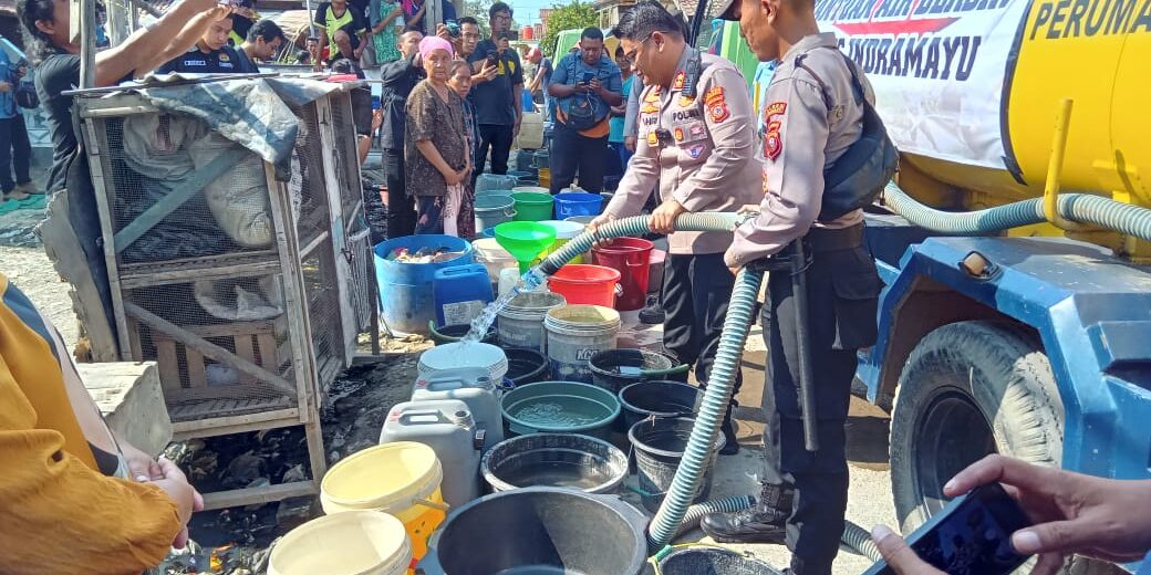 PAKKAR.ORG – INDRAMAYU JAWA BARAT:Polres Indramayu bekerjasama dengan Perumda Air minum Tirta Darma Ayu berikan bantuan air bersih sebanyak 23 ribu liter kepada warga Desa Kerangkeng, Kecamatan Kerangkeng, Kabupaten Indramayu, yang terbagi di dua blok, yaitu salah satunya di blok Oyoran Rt/Rw 005/005, dan di blok Kubur Rt/Rw 008/004 Senin (28/08/2023).