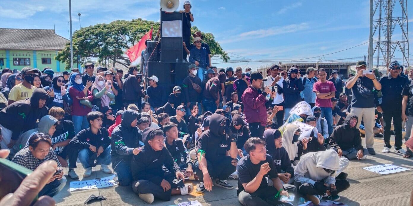 PAKKAR.ORG-INDRAMAYU JAWA BARAT:Aliansi Masyarakat Seluruh Kecamatan Krangkeng (AMSK) melakukan aksi demontrasi di depan Pabrik Sepatu PT Sun Bright Lestari (SBL) yang berlokasi di Jalan Raya Cirebon-Indramayu Desa Dukuhjati Kecamatan Krangkeng Kabupaten Indramayu Jawa Barat, Rabu (27/8/2025).